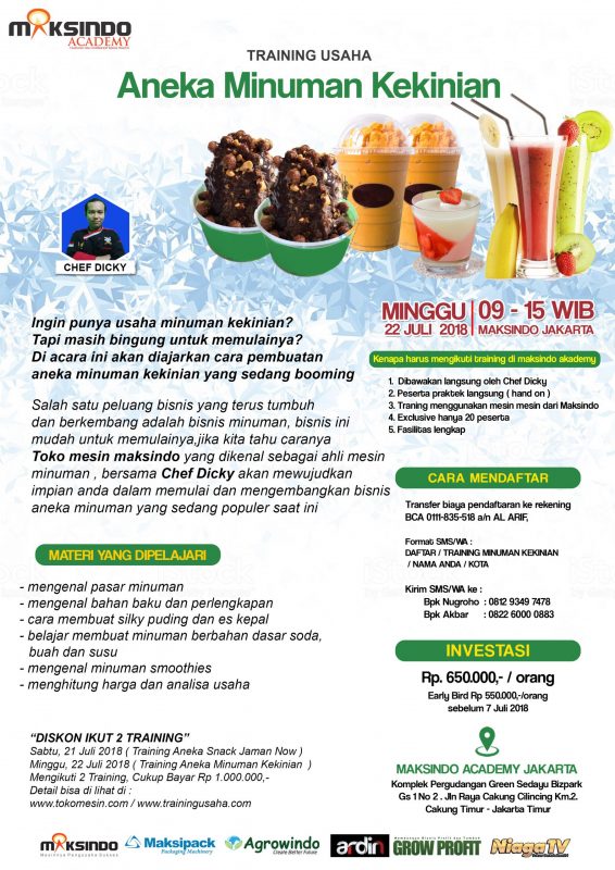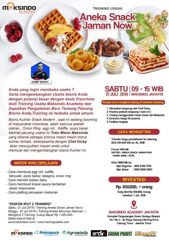 TRAINING USAHA OLAHAN BERBAHAN DASAR PISANGÂ Sabtu, 15 September 2018 Â Ingin Tahu Pisang bisa di olah menjadi apa saja? Atau menjadi peluang usaha bagi anda Kami PT .Toko Mesin Maksindo yang sudah di kenal sebagai ahlinya mesin-mesin untuk usaha, akan memberikan materi pembelajaran cara pengolahan Pisang dan resepnya yang akan di pandu oleh Chef Dicky. […]