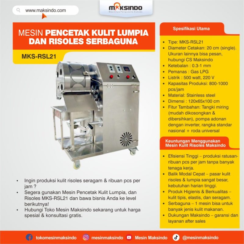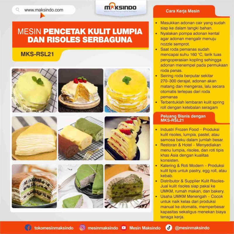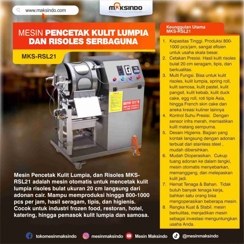 Mesin Pencetak Kulit Lumpia, dan Risoles Serbaguna MKS-RSL21, semua bisa lebih cepat, higienis, dan efisien. Mesin ini mampu mencetak kulit risoles bulat ukuran 20 cm secara otomatis langsung dari adonan cair, dengan hasil tipis, lembut, dan konsisten.