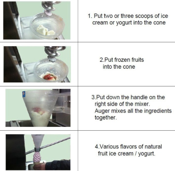 - Mudah membersihkan mesin, sehingga Anda dengan cepat bisa mengganti bahan untuk membuat minuman atau es krim jenis lainnya. (Jet cleaning, ready to use effective solution to ice cream in the production process of different fruits and odor problems)
