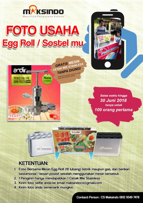 Foto Usaha Egg Roll / Sostel mu   GRATIS MESIN CETAK MIE STAINLESS TANPA DIUNDI Batas waktu hingga 30 Juni 2018 Hanya untuk 100 orang pertama KETENTUAN Foto Bersama Mesin Egg Roll (10 lubang) listrik maupun gas, dan berikan testimonial / kesan positif setelah menggunakan mesin tersebut 1 Pengirim hanya mendapatkan 1 Cetak Mie Stainless […]