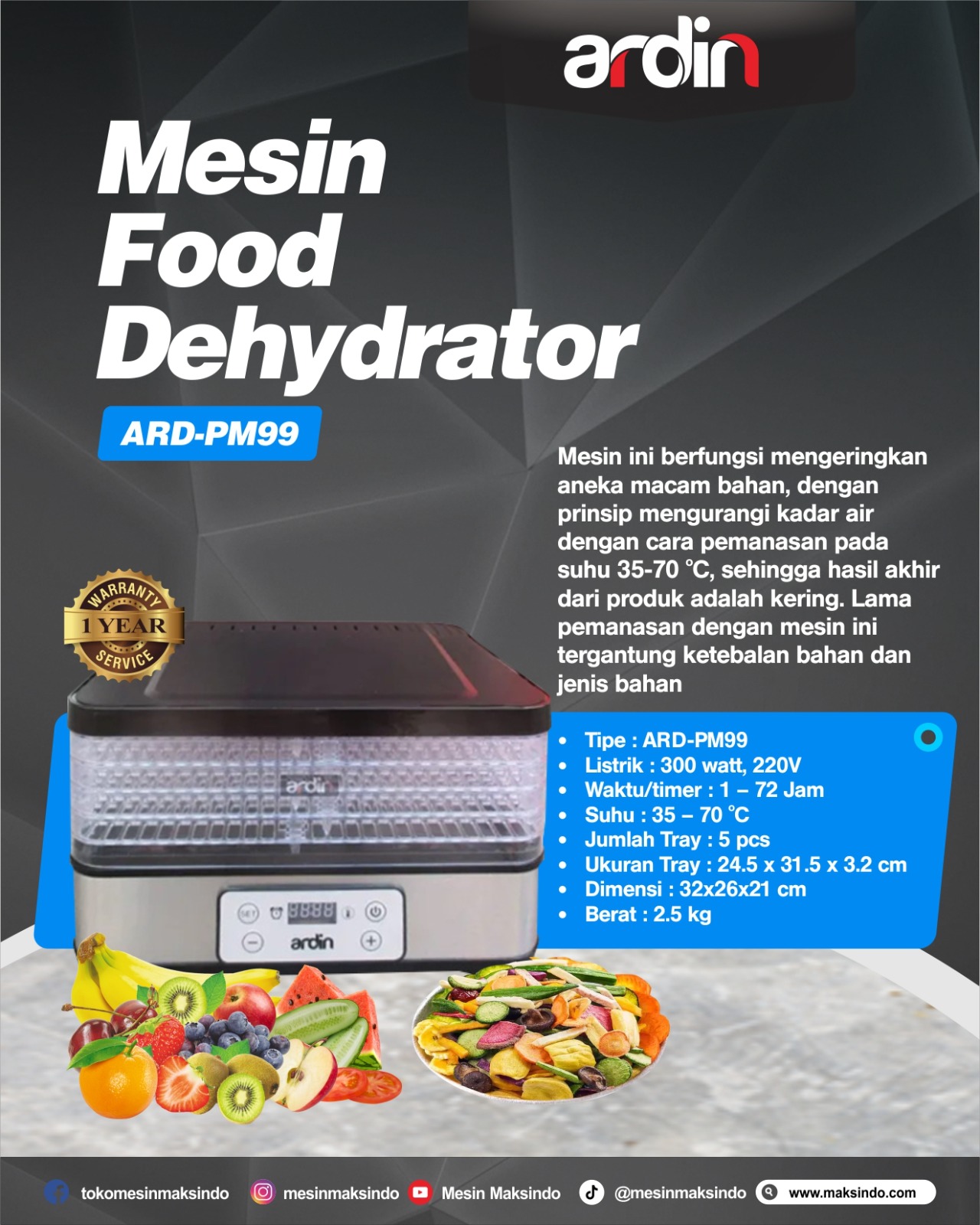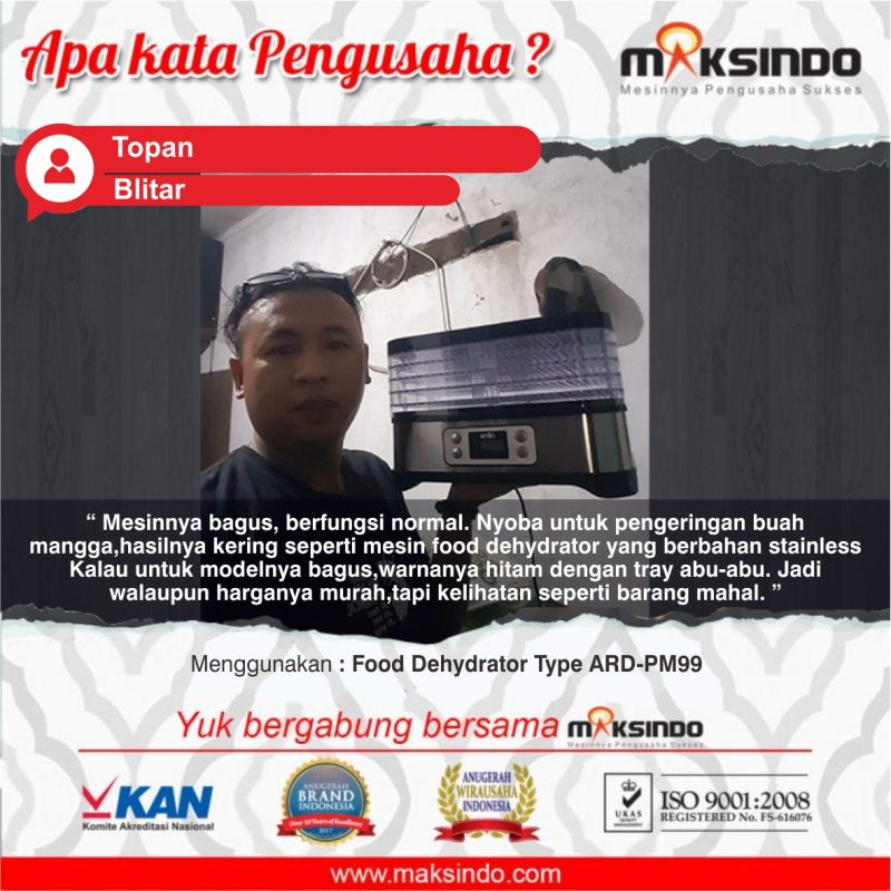 Maksindo adalah pelopor penyedia mesin pengering makanan atau food dehydrator terlengkap dengan berbagaipilihan kapasitas, mulai dari kapasitas kecil hingga besar. Salah satu mesin pengering dengan kapasitas kecil adalah mesin food dehydrator type ARD-PM99 Ardin.