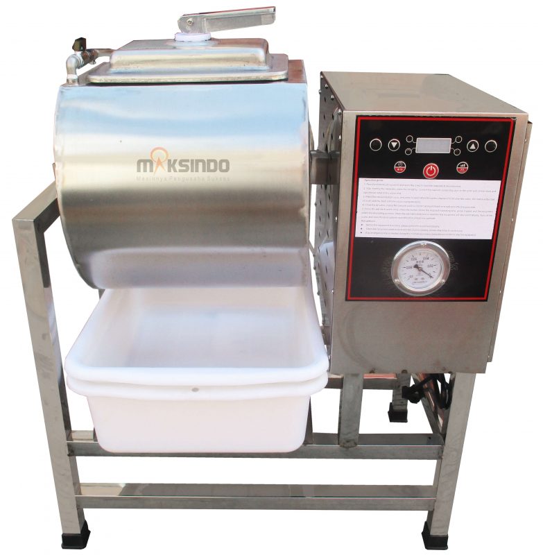 Mesin Meat Seasoning Mixer Vacuum merupakan mesin pemcampur daging dengan bumbu atau biasa di sebut marinasi. Mesin ini memiliki sistem vakum yang berfungsi untuk memperbesar pori daging agar bumbu dapat meresap hingga ke bagian dalam daging. Selain untuk daging , mesin mixer vacuum juga dapat digunakan untuk marinasi aneka sayuran. Proses pencampuran daging dan bumbu menggunakan mesin mixer vacuum MKS-MNS77 lebih efektif sehingga dapat menghemat waktu.
