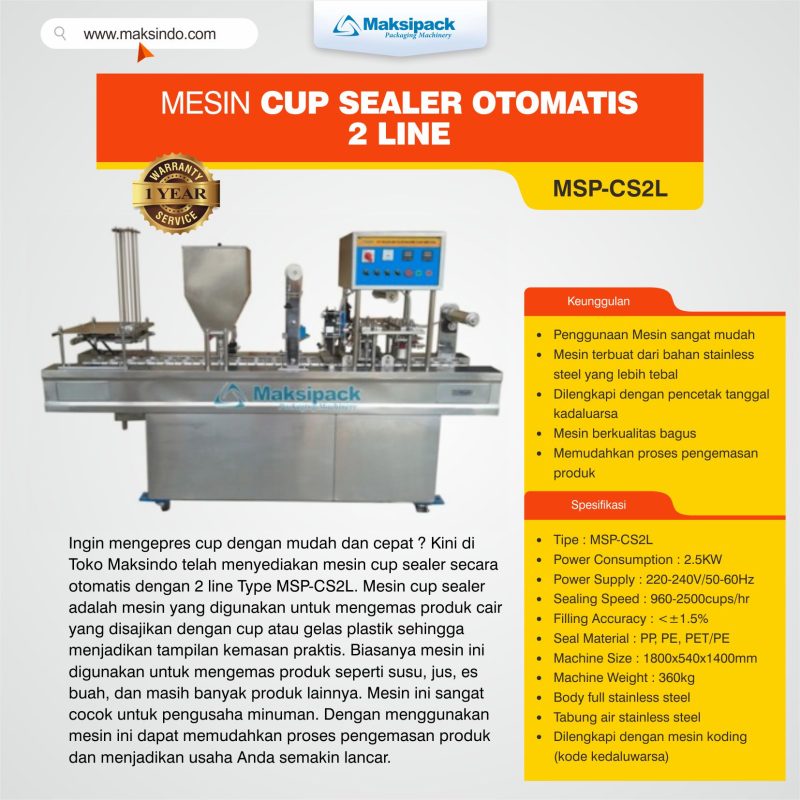 Ingin mengepres cup dengan mudah dan cepat ? Kini di Toko Maksindo telah menyediakan mesin cup sealer secara otomatis dengan 2 line Type MSP-CS2L. Mesin cup sealer adalah mesin yang digunakan untuk mengemas produk cair yang disajikan dengan cup atau gelas plastik sehingga menjadikan tampilan kemasan praktis. Biasanya mesin ini digunakan untuk mengemas produk seperti susu, jus, es buah, dan masih banyak produk lainnya. Mesin ini sangat cocok untuk pengusaha minuman. Dengan menggunakan mesin ini dapat memudahkan proses pengemasan produk dan menjadikan usaha Anda semakin lancar.