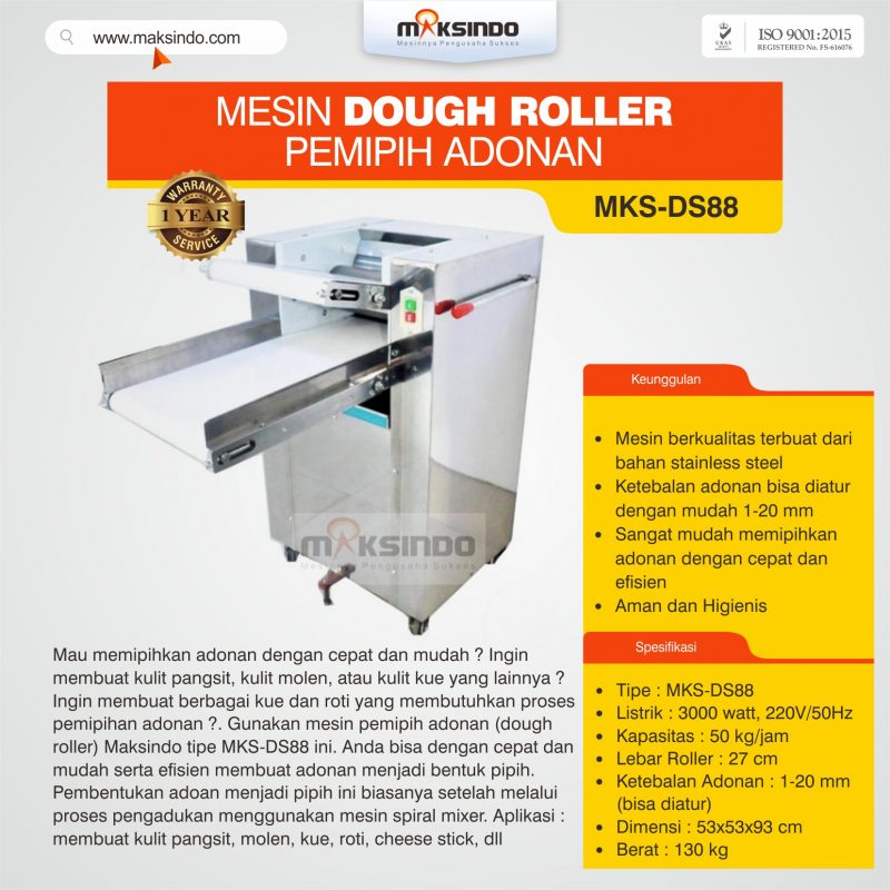 Gunakan mesin pemipih adonan (dough roller) Maksindo tipe MKS-DS88 ini. Anda bisa dengan cepat dan mudah serta efisien membuat adonan menjadi bentuk pipih. Pembentukan adoan menjadi pipih ini biasanya setelah melalui proses pengadukan menggunakan mesin spiral mixer