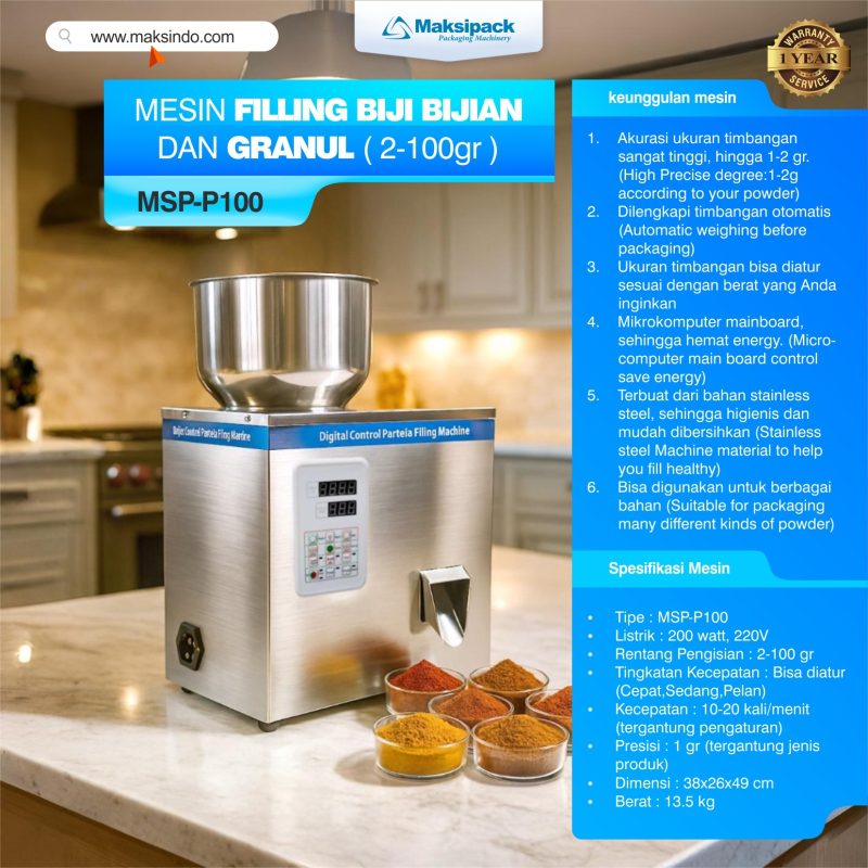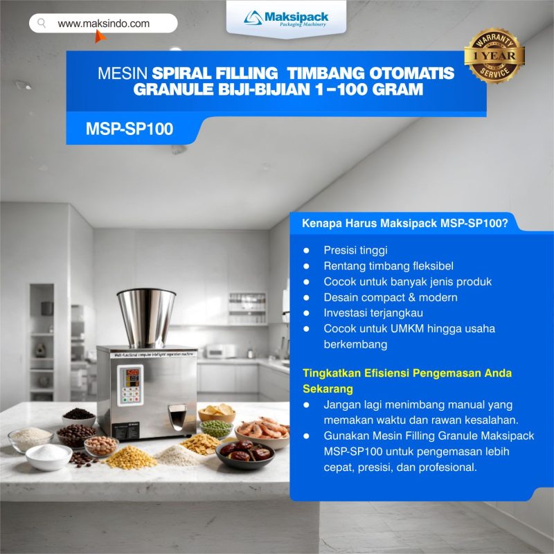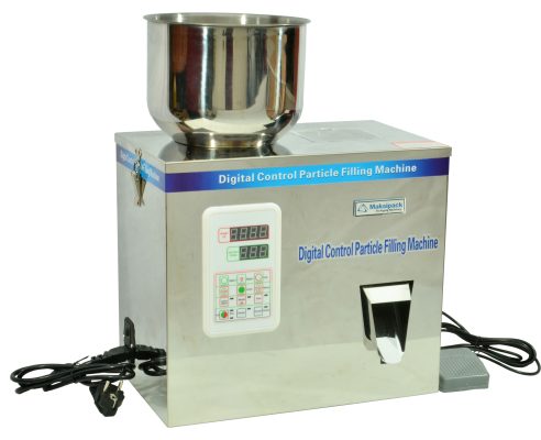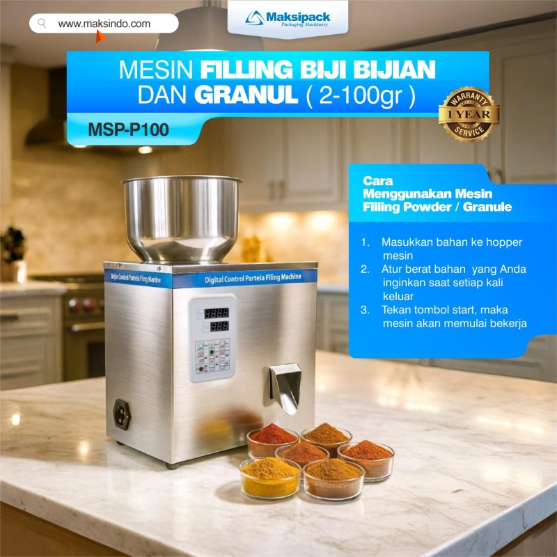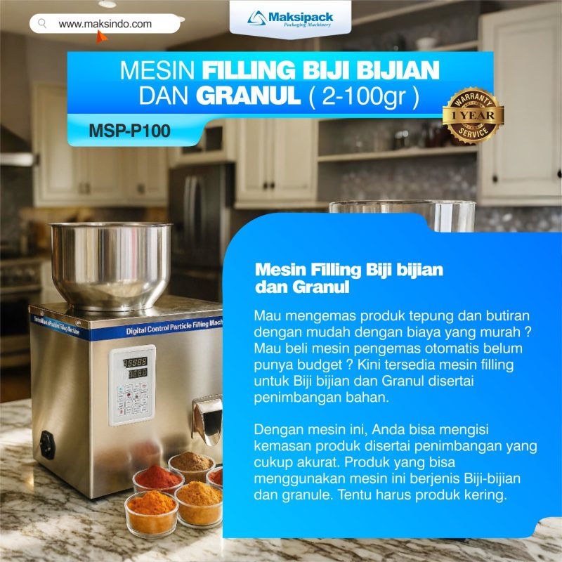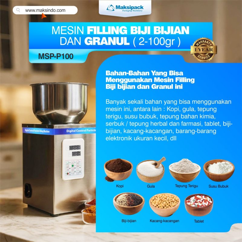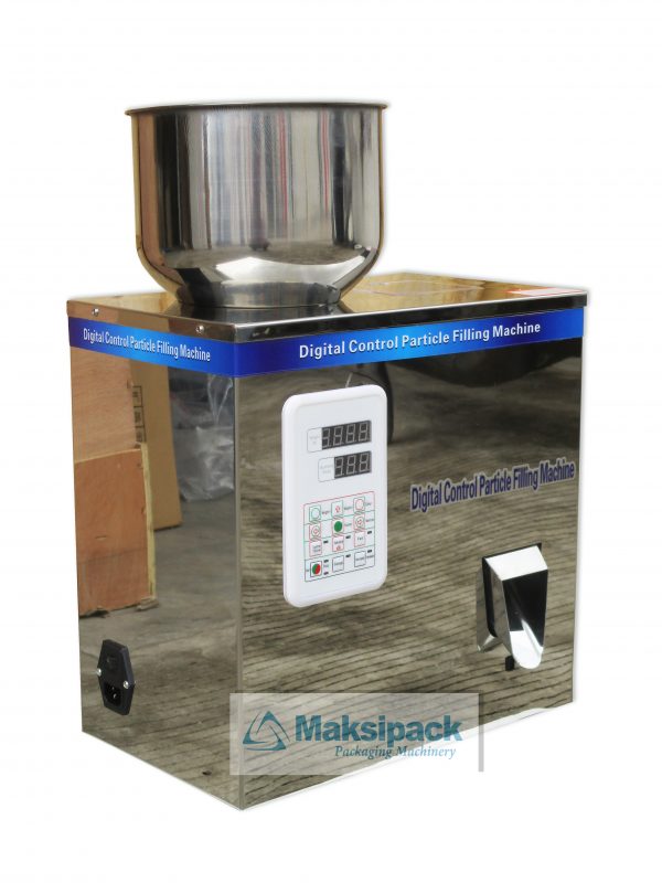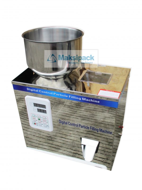 Dengan mesin ini, Anda bisa mengisi kemasan produk disertai penimbangan yang cukup akurat. Produk yang bisa menggunakan mesin ini berjenis Biji-bijian dan granule. Tentu harus produk kering.