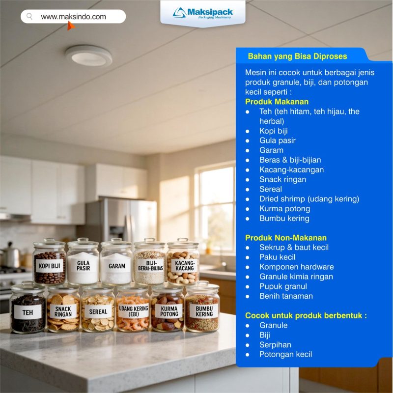 Banyak sekali bahan yang bisa menggunakan mesin ini, antara lain : Kopi, gula, tepung terigu, susu bubuk, tepung bahan kimia, serbuk / tepung herbal dan farmasi, tablet, biji-bijian, kacang-kacangan, barang-barang elektronik ukuran kecil, dll