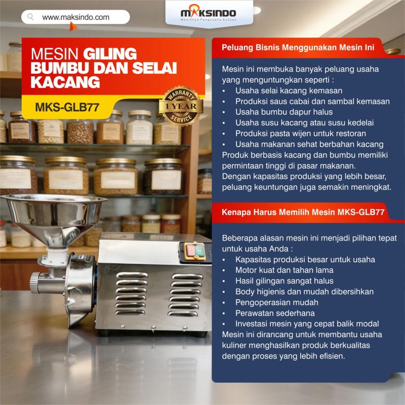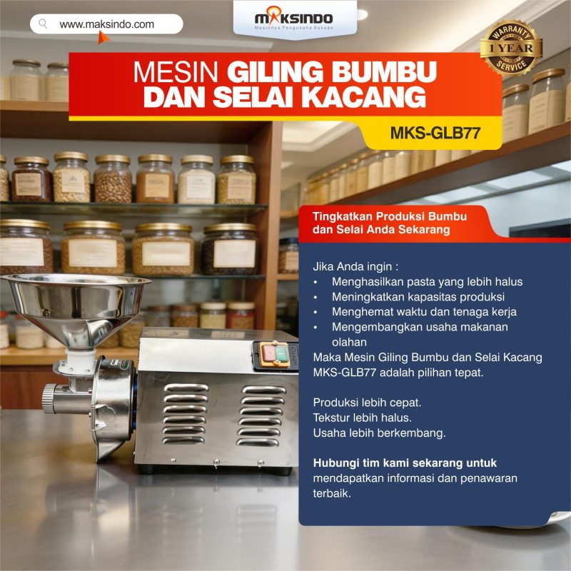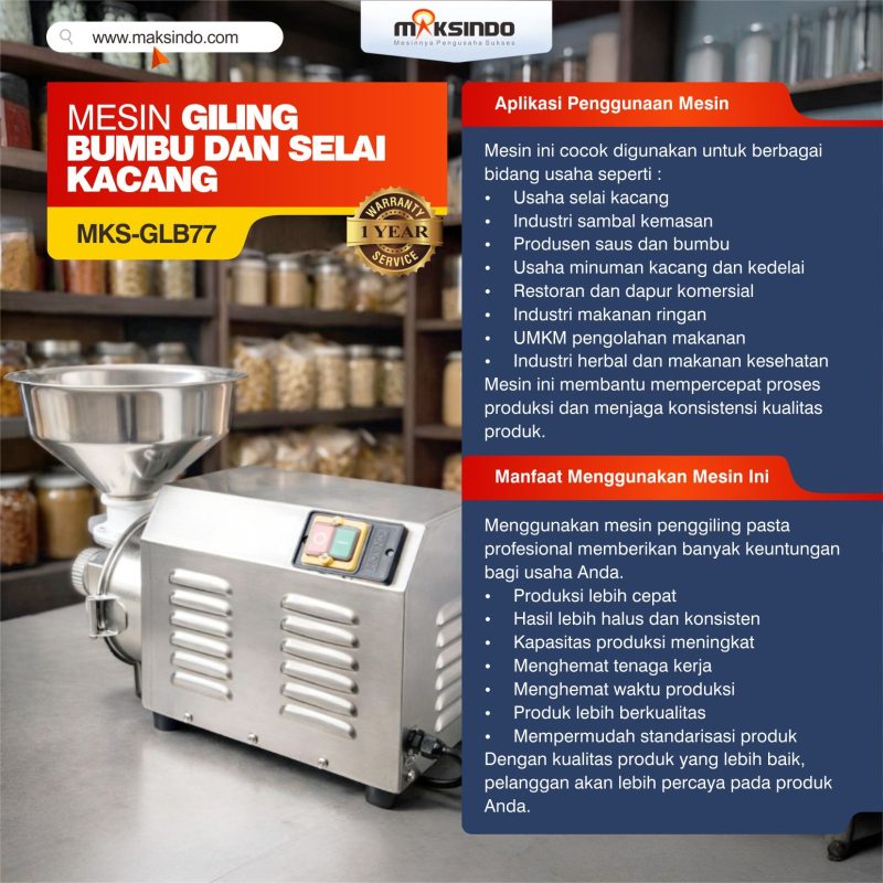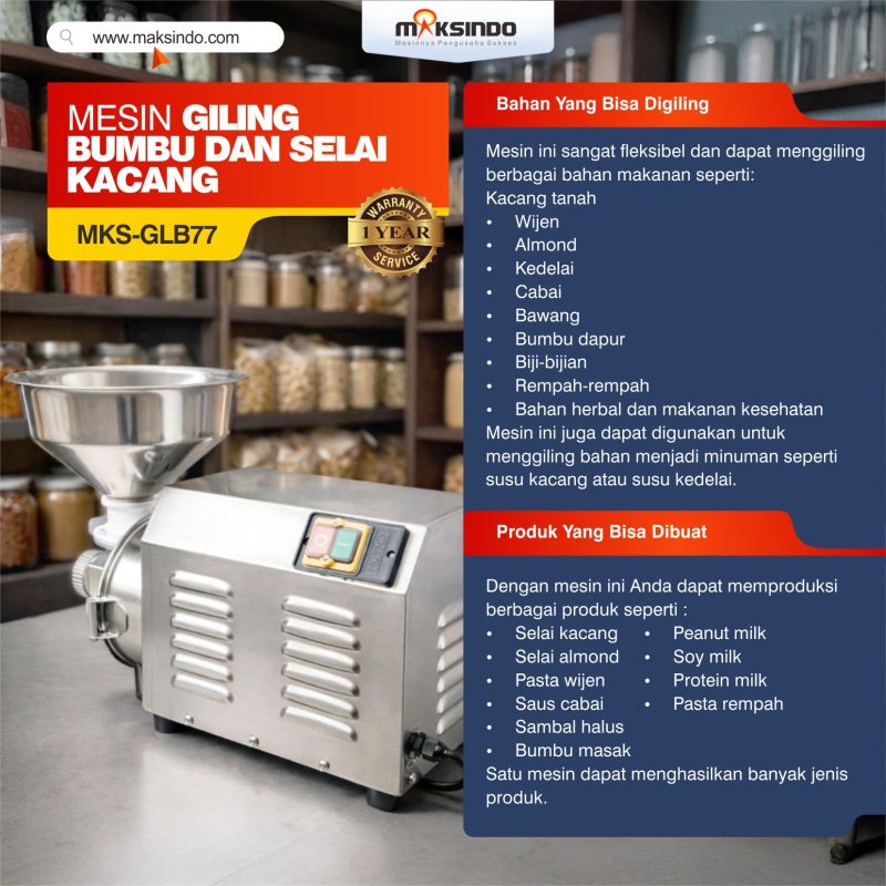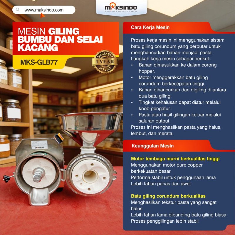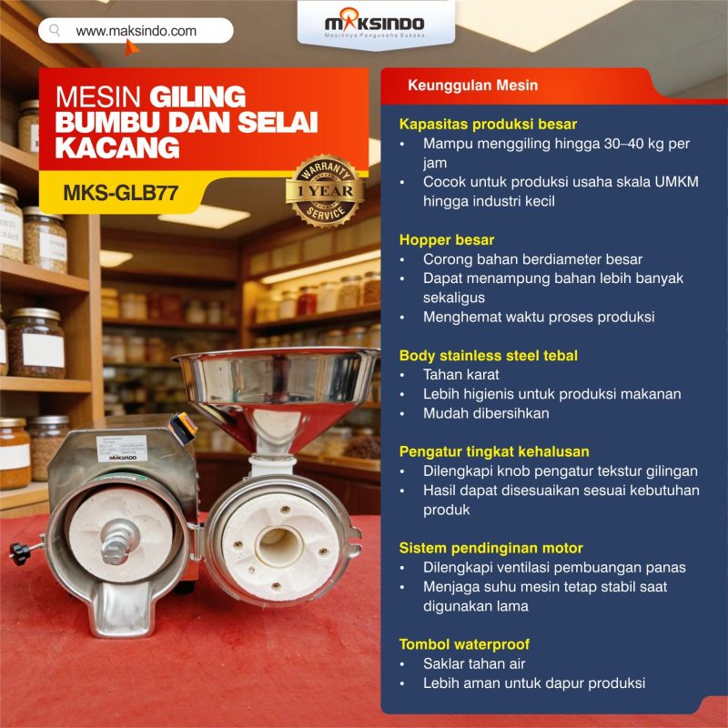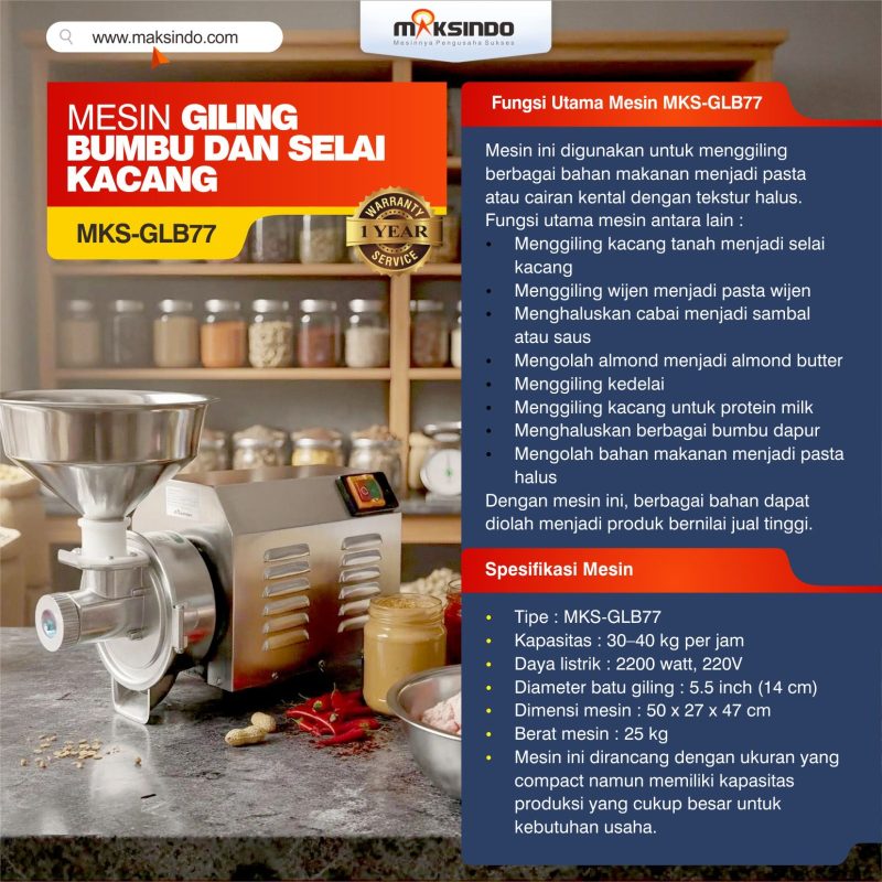 Toko Mesin Maksindo menghadirkan aneka mesin giling bumbu dengan type dan kapasitas yang berbeda . Salah satu type terbaru Mesin Giling Bumbu MKS-GLB77 ini. Mesin dengan kapasitas 30 sampai 40 kilogram per jam ini , mampu membantu mempercepat proses memasak Anda dalam menghaluskan bumbu makanan .