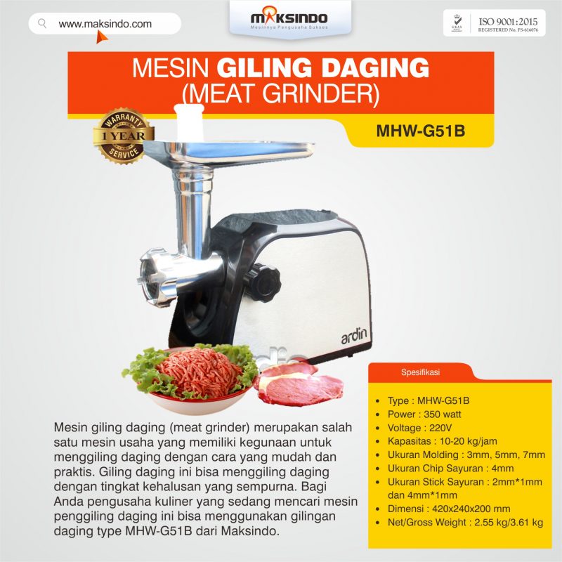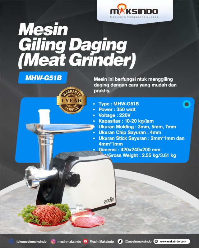 Mesin giling daging (meat grinder) merupakan salah satu mesin usaha yang memiliki kegunaan untuk menggiling daging dengan cara yang mudah dan praktis. Giling daging ini bisa menggiling daging dengan tingkat kehalusan yang sempurna. Bagi Anda pengusaha kuliner yang sedang mencari mesin penggiling daging ini bisa menggunakan gilingan daging type MHW-G51B dari Maksindo.