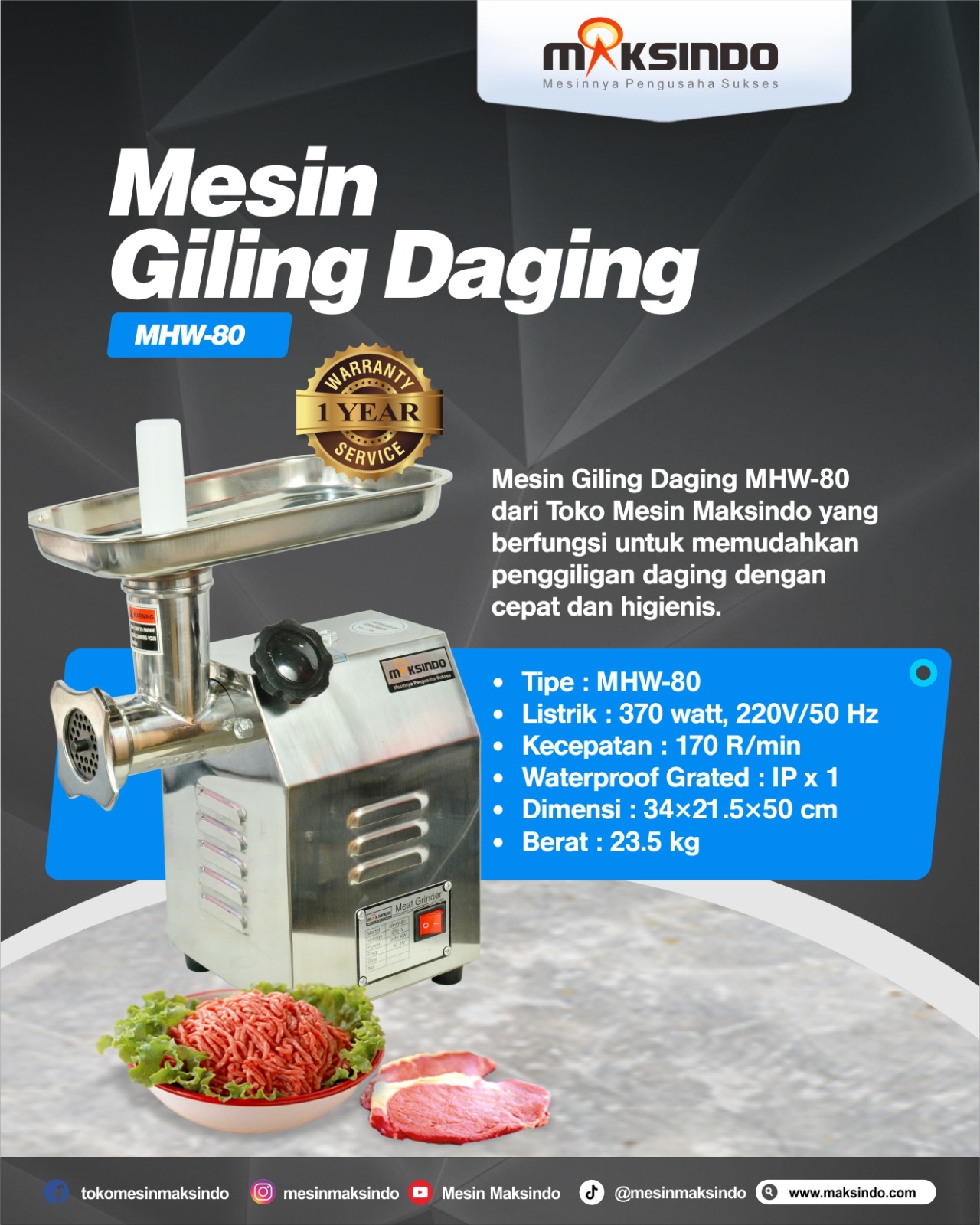 Saat ini bisnis kuliner di Indonesia semakin banyak dan berkembang pesat. Prospek bisnis kuliner kini jadi lebih unggul karena menguntungkan. Baik dari bisnis makanan kecil-kecilan sampai bisnis makanan besar. Mudahkan kebutuhan produksi bahan daging untuk aneka usaha kuliner Anda dengan menggunakan mesin-mesin berkualitas dari Toko Mesin Maksindo. Salah satu nya dengan Mesin penggiling daging Maksindo model MHW-80 ini.