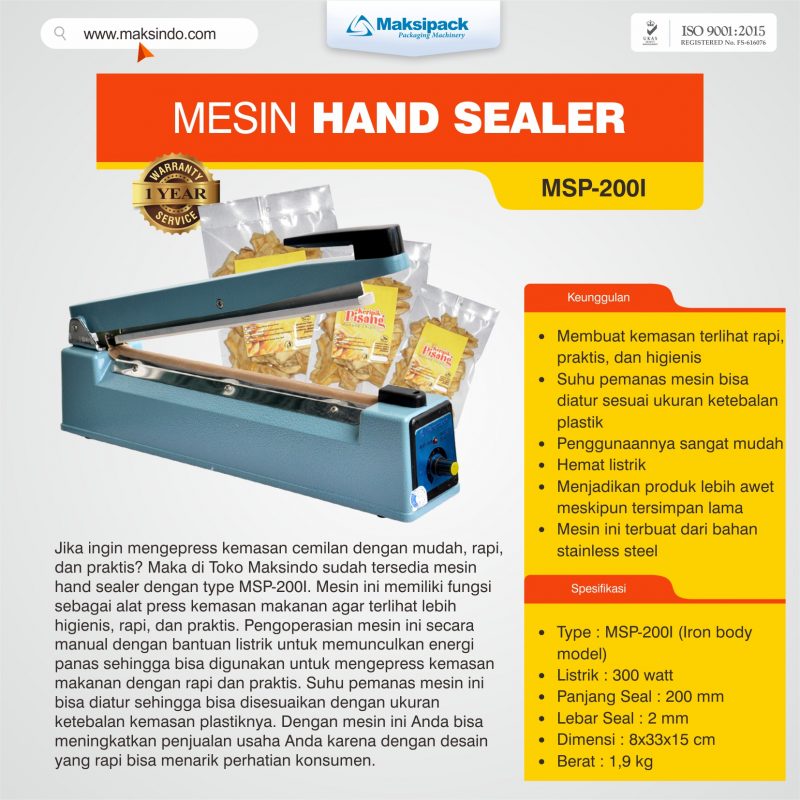 Jika ingin mengepress kemasan cemilan dengan mudah, rapi, dan praktis? Maka di Toko Maksindo sudah tersedia mesin hand sealer dengan type MSP-200I. Mesin ini memiliki fungsi sebagai alat press kemasan makanan agar terlihat lebih higienis, rapi, dan praktis. Pengoperasian mesin ini secara manual dengan bantuan listrik untuk memunculkan energi panas sehingga bisa digunakan untuk mengepress kemasan makanan dengan rapi dan praktis. Suhu pemanas mesin ini bisa diatur sehingga bisa disesuaikan dengan ukuran ketebalan kemasan plastiknya. Dengan mesin ini Anda bisa meningkatkan penjualan usaha Anda karena dengan desain yang rapi bisa menarik perhatian konsumen.