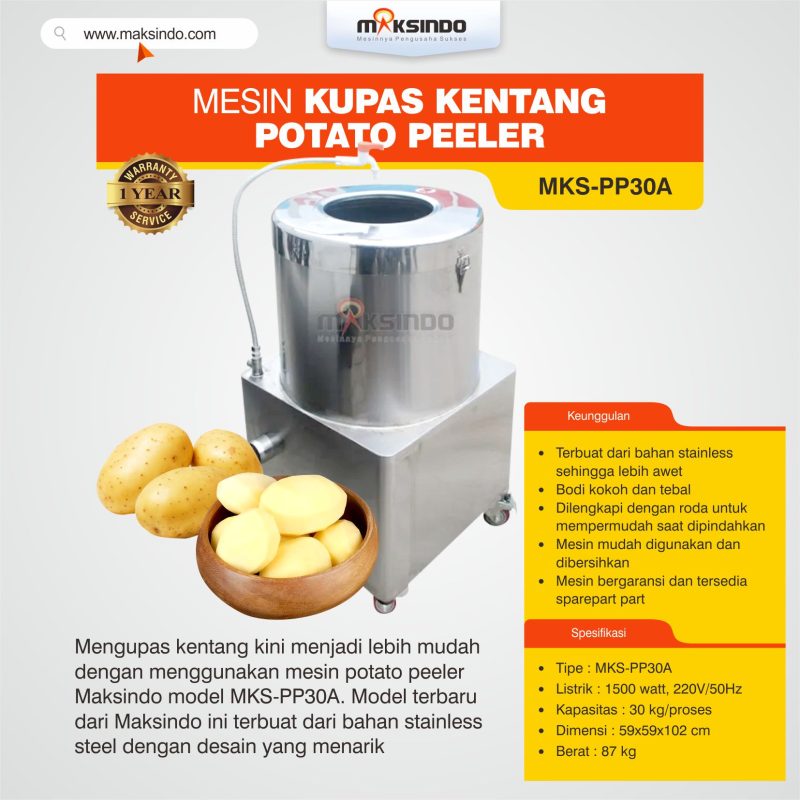 Mengupas kentang kini menjadi lebih mudah dengan menggunakan mesin potato peeler Maksindo model MKS-PP30A. Model terbaru dari Maksindo ini terbuat dari bahan stainless steel dengan desain yang menarik
