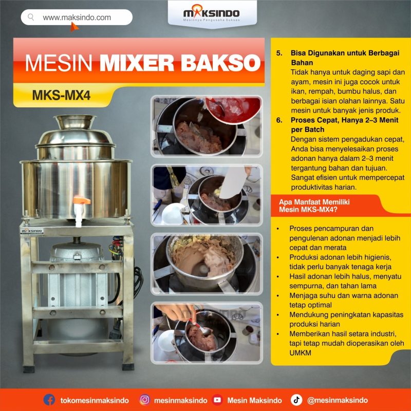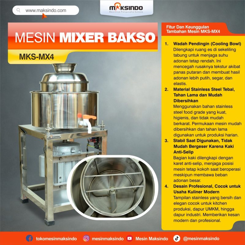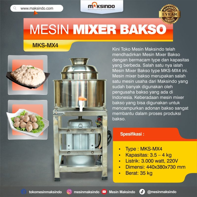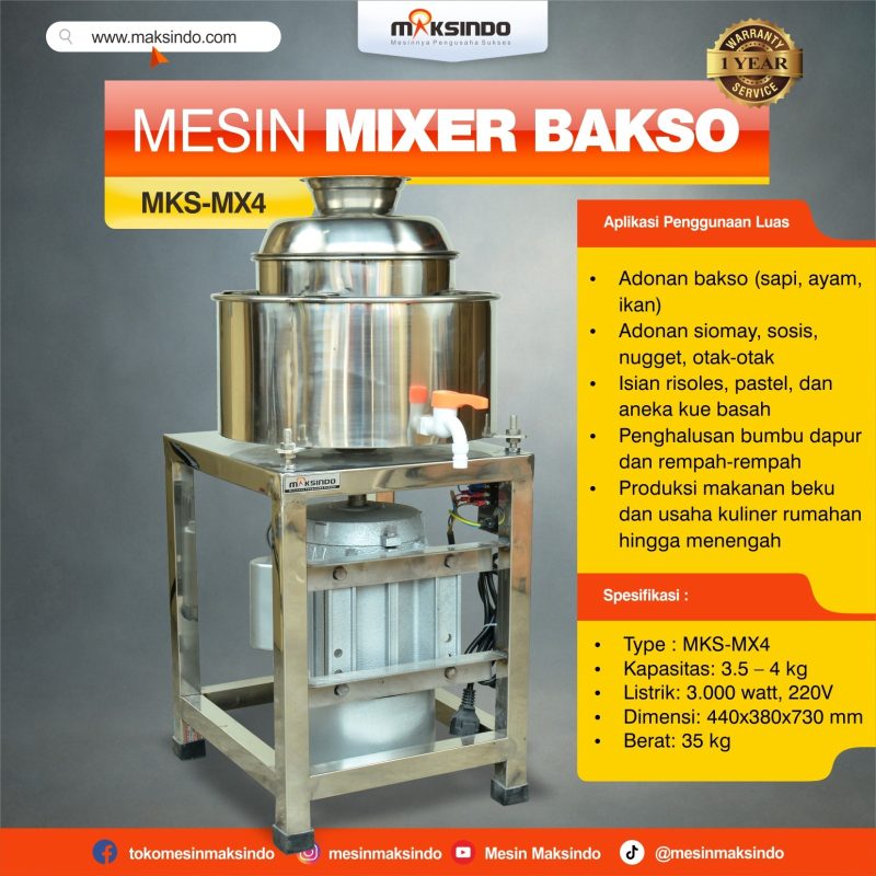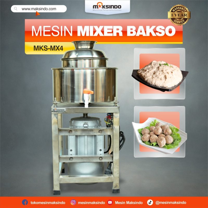 Kini Toko Mesin Maksindo telah mendhadirkan Mesin Mixer Bakso dengan bermacam type dan kapasitas yang berbeda. Salah satu nya ialah Mesin Mixer Bakso type MKS-MX4 ini. Mesin mixer bakso merupakan salah satu mesin usaha dari Maksindo yang sudah banyak digunakan oleh pengusaha bakso yang ada di Indonesia. Keberadaan mesin mixer bakso yang bisa digunakan untuk mencampurkan adonan bakso sangat membantu dalam proses produksi bakso.