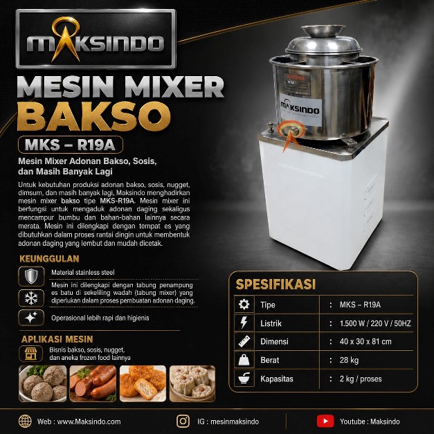 PT Mesin Maksindo menjual mesin mixer / molen adonan bakso. Mesin mixer ini berfungsi untuk mengaduk adonan bakso. Mesin ini dilengkapi dengan tempat es.