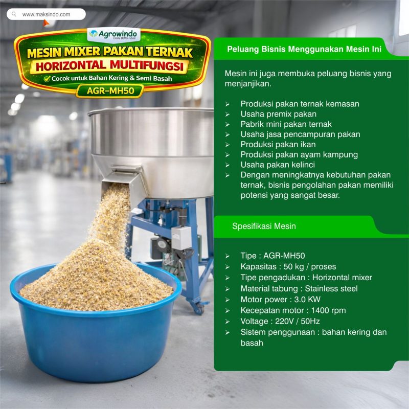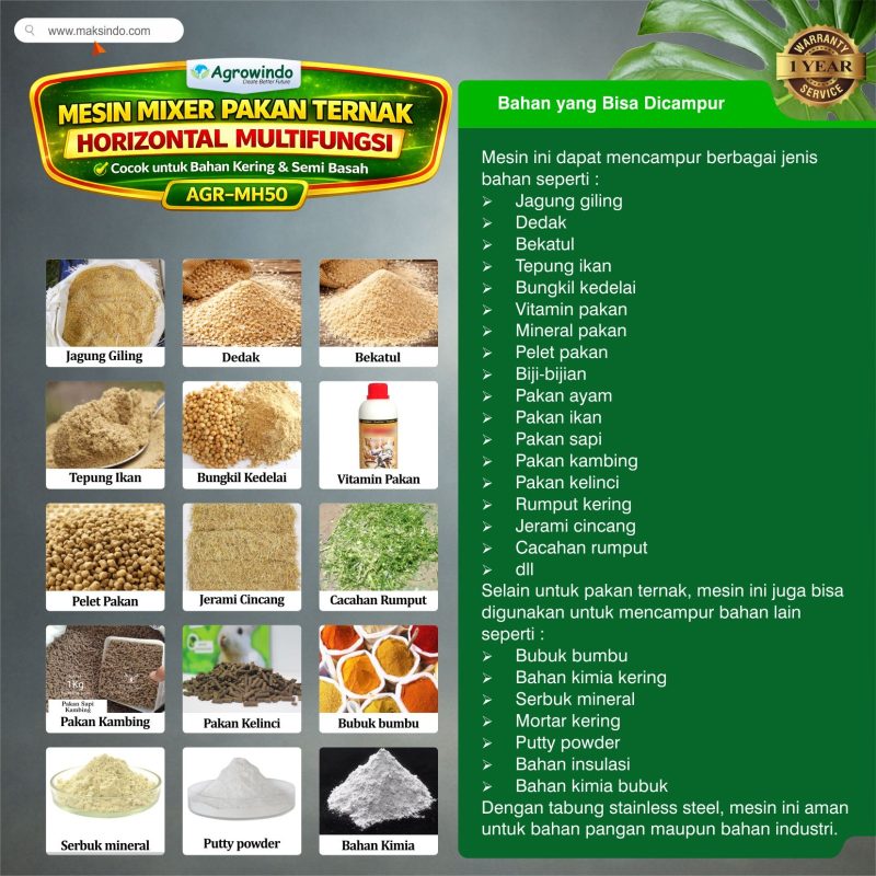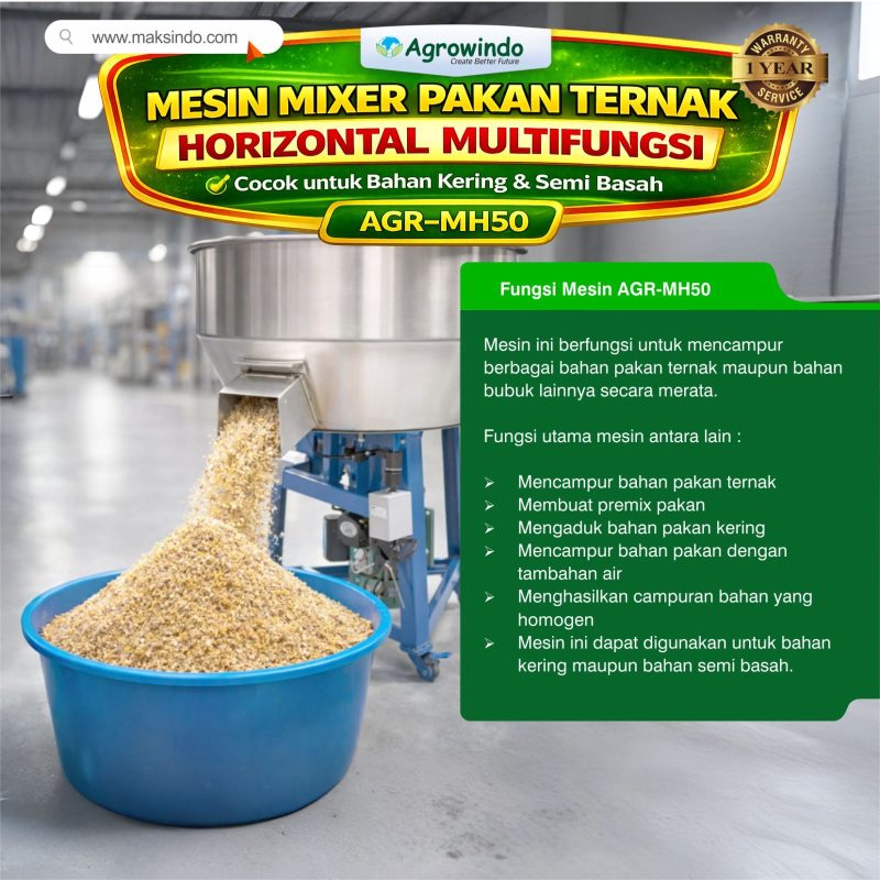 Mesin Mixer Pakan Ternak Horizontal Agrowindo AGR-MH50 adalah mesin pengaduk pakan dengan kapasitas 50 kg per proses yang dirancang untuk mencampur berbagai bahan pakan ternak secara cepat dan merata. Mesin ini menggunakan sistem pengadukan horizontal dengan paddle berputar di dalam tabung stainless steel sehingga mampu menghasilkan campuran bahan yang homogen, baik untuk bahan kering maupun semi basah. Cocok digunakan untuk mencampur jagung giling, dedak, bekatul, tepung ikan, bungkil kedelai, vitamin dan mineral pakan, hingga bahan bubuk industri seperti bumbu, premix, dan bahan kimia kering. Dengan motor 3 KW berkecepatan 1400 rpm, mesin ini sangat ideal untuk peternakan ayam, sapi, kambing, ikan, serta usaha produksi pakan ternak skala UMKM hingga pabrik mini pakan.