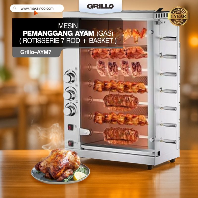 Dapatkan Grillo–AYM7 Gas Rotisserie (7 Rod + Basket Pemanggang) sekarang juga!