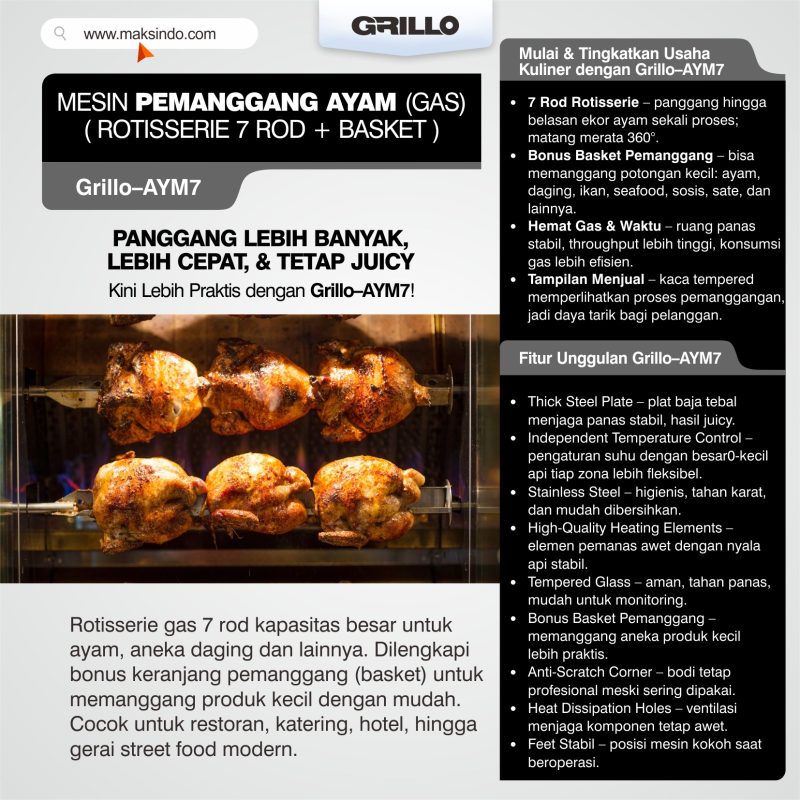 Vidio Mesin Pemanggang Ayam Gas Grillo–AYM7 (Rotisserie 7 Rod + Basket):