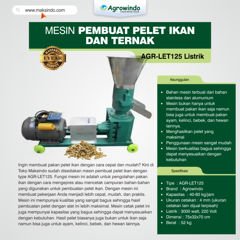 Ingin membuat pakan pelet ikan dengan cara cepat dan mudah? Kini di Toko Maksindo sudah disediakan mesin pembuat pelet ikan dengan type AGR-LET125. Fungsi mesin ini adalah untuk pengolahan pakan ikan dengan cara mengepres atau mencetak campuran bahan-bahan yang digunakan untuk pembuatan pelet ikan. Dengan mesin ini membuat pekerjaan Anda menjadi lebih cepat, mudah, dan praktis. Mesin ini mempunyai kualitas yang sangat bagus sehingga hasil pembuatan pelet dengan alat ini lebih maksimal. Mesin cetak pelet ini juga mempunyai kapasitas yang bagus sehingga dapat menyesuaikan dengan kebutuhan. Hasil pelet biasanya juga bukan untuk ikan saja namun bisa juga untuk ayam, kelinci, bebek, dan hewan lainnya.