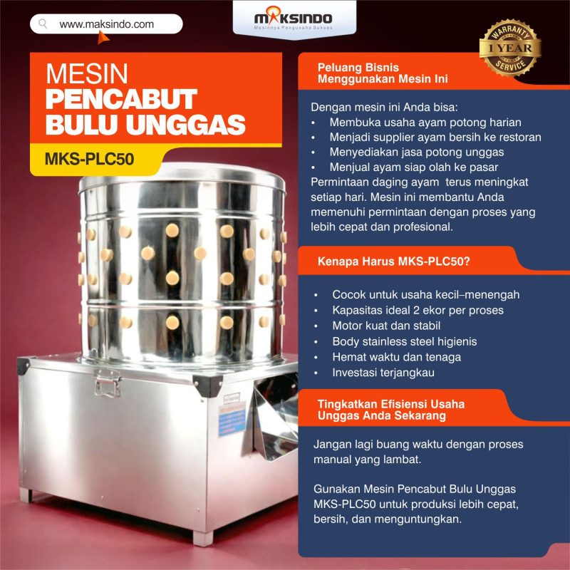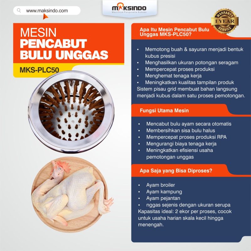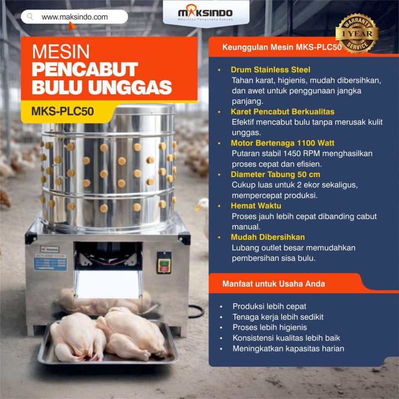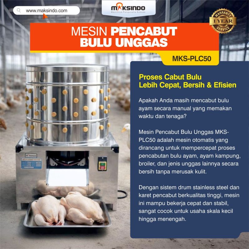 Dalam dunia usaha pengolahan ayam dan unggas, kecepatan dan kebersihan adalah dua hal yang sangat penting. Proses pencabutan bulu unggas secara manual bukan hanya memakan waktu, tetapi juga melelahkan dan kurang higienis. Karena itu, Maksindo menghadirkan Mesin Pencabut Bulu Unggas MKS-PLC50, mesin profesional yang dirancang khusus untuk mempermudah dan mempercepat proses produksi Anda.