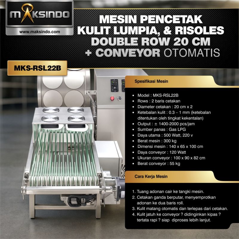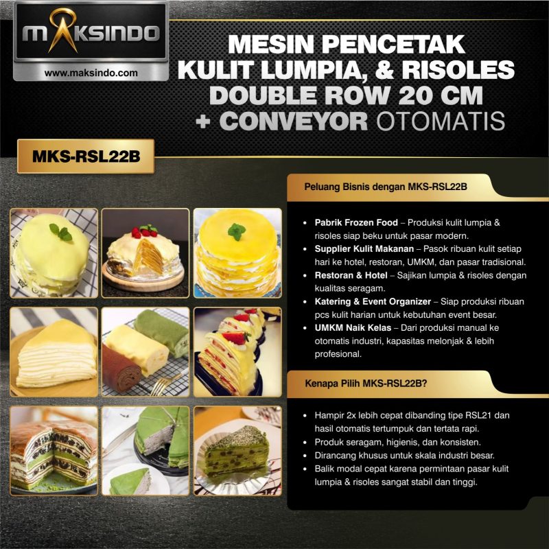 MKS-RSL22B adalah mesin otomatis untuk produksi kulit risoles, lumpia, kebab, duck cake, egg roll, samosa, curry leather, hingga kulit pastel. Bahan kulit adalah dari adonan cair.