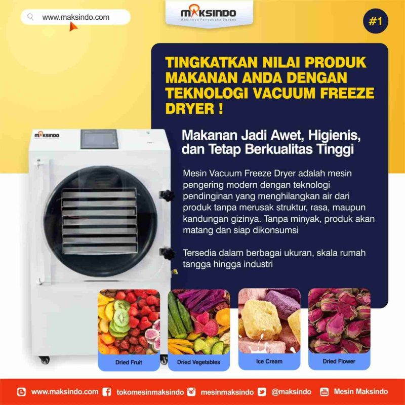 Dalam dunia industri pangan dan farmasi modern, pengeringan beku vakum (freeze drying) telah menjadi metode unggulan untuk menjaga kualitas, nutrisi, dan masa simpan produk. Salah satu mesin andalan di kategori ini adalah Mesin Pengering Beku Vakum MKS-VFD25 dari Maksindo. Dirancang dengan teknologi tinggi dan bahan berkualitas, mesin ini menawarkan solusi efisien untuk kebutuhan pengeringan berbagai jenis produk dengan hasil yang baik.