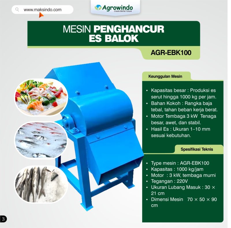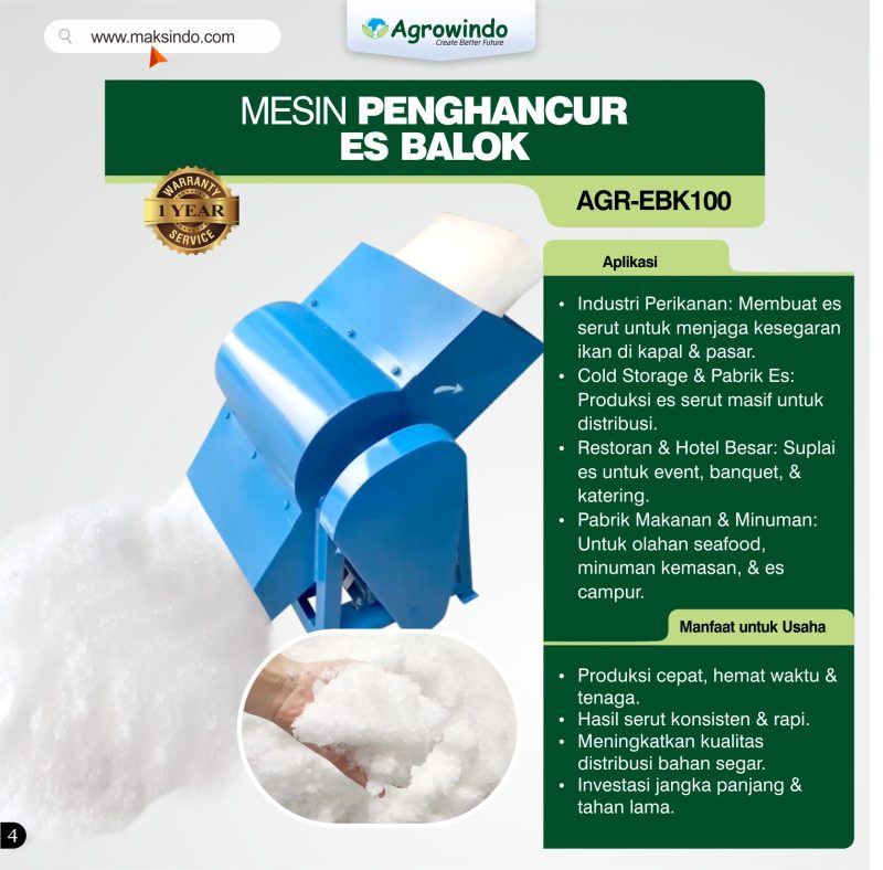 Apakah Anda sedang mencari mesin untuk menghancurkan es batu? Kini Mesin Penghancur Es Balok AGR-EBK100 sudah tersedia di Toko Mesin Maksindo. Mesin penghancur es batu merupakan alat yang dirancang khusus untuk menghancurkan es balok menjadi serpihan kecil dengan cepat dan efisien. Salah satu keunggulan yang dimiliki oleh mesin ini yaitu memiliki bodi yang kuat dan desain yang kokoh, AGR-EBK100 mampu bekerja secara optimal untuk memenuhi kebutuhan bisnis Anda.