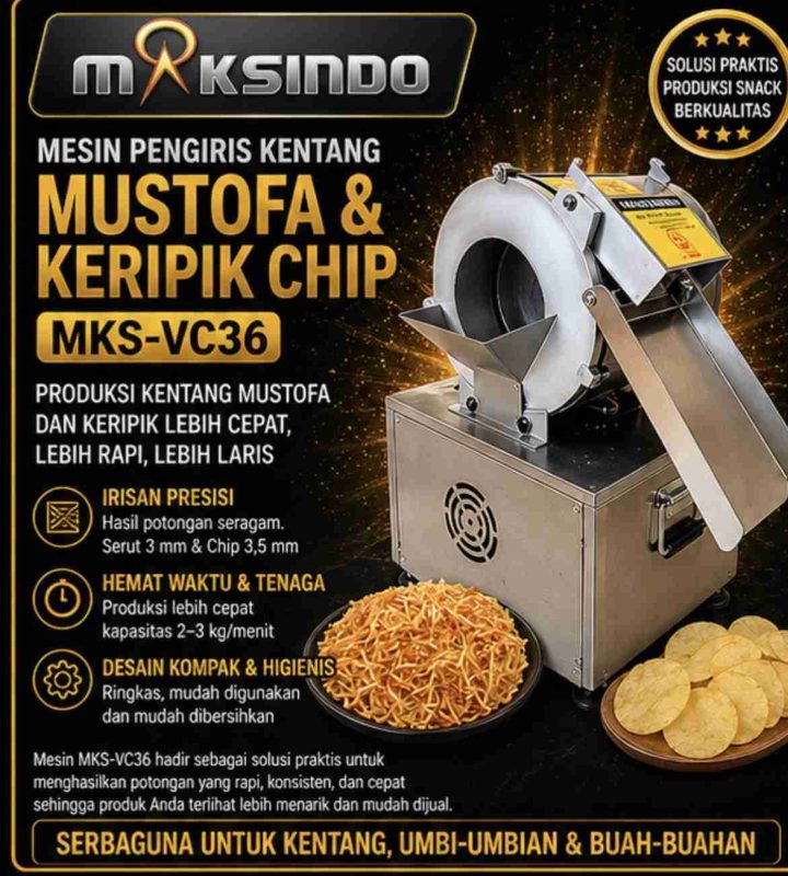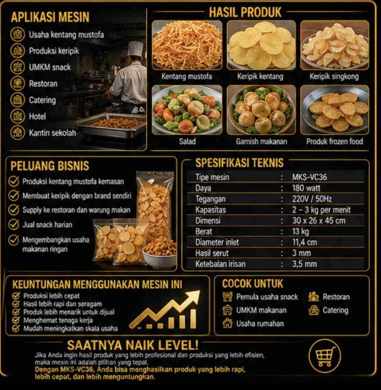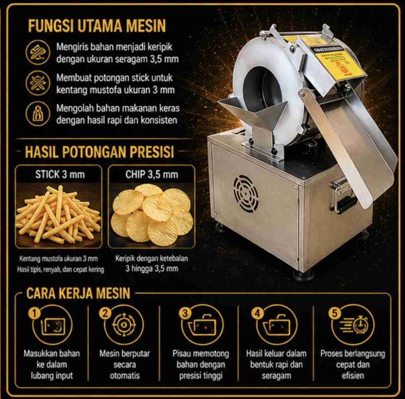 Bisnis snack selalu punya pasar yang besar, terutama produk seperti kentang mustofa dan keripik. Namun tantangan terbesar ada pada proses produksi. Irisan manual sering menghasilkan potongan yang tidak seragam, ketebalan berbeda-beda, bentuk kurang rapi, serta membutuhkan waktu dan tenaga yang besar. Akibatnya produk terlihat kurang profesional dan sulit bersaing di pasar.