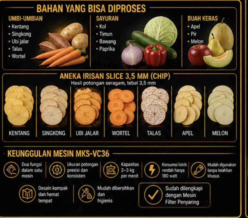 Mesin MKS-VC36 hadir sebagai solusi praktis untuk menghasilkan potongan yang rapi, konsisten, dan cepat sehingga produk Anda terlihat lebih menarik dan mudah dijual.