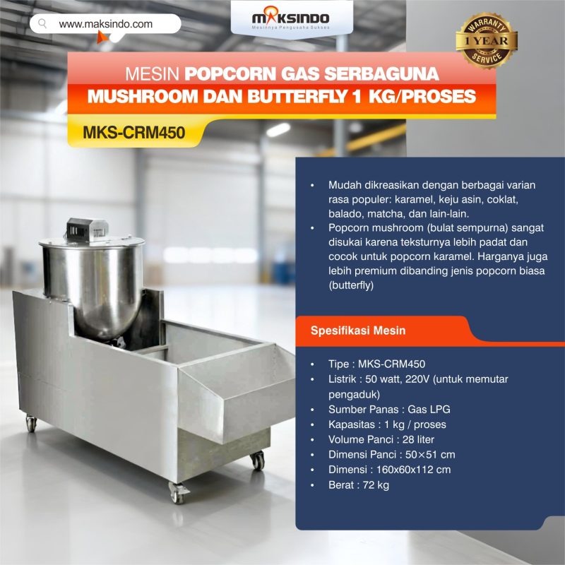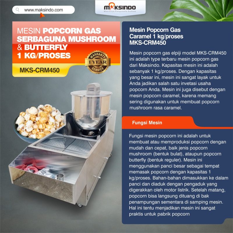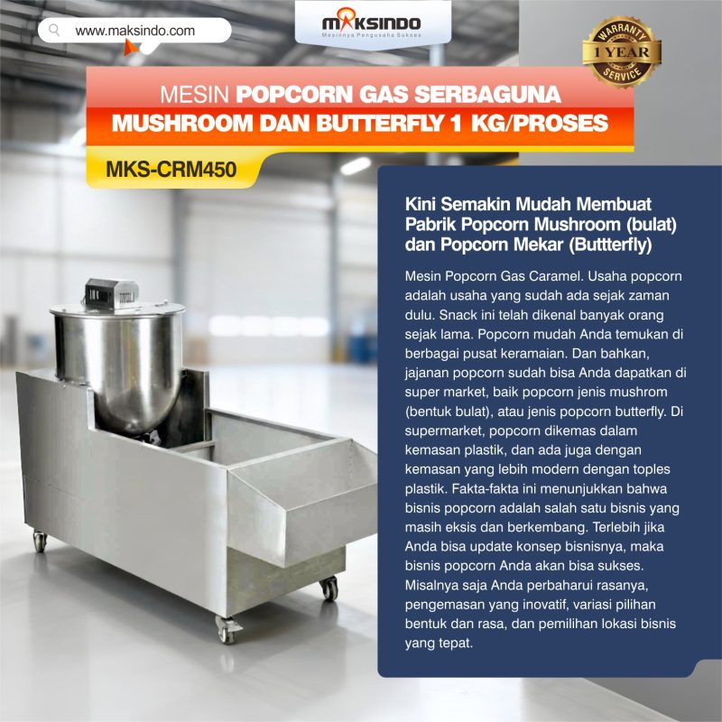 Mesin popcorn gas elpiji model MKS-CRM450 ini adalah type terbaru mesin popcorn gas dari Maksindo. Kapasitas mesin ini adalah sebanyak 1 kg/proses. Dengan kapasitas yang besar ini, mesin ini sangat layak untuk Anda jadikan salah satu invetasi usaha popcorn Anda. Mesin ini juga disebut dengan mesin popcorn caramel, karena memang sering digunakan untuk membuat popcorn mushroom rasa caramel.