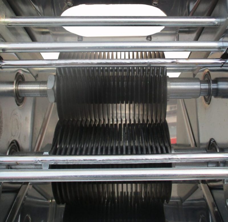 - Mesin di tengah adalah mesin utama untuk mengiris daging, sayuran dan buah-buahan. Hasil irisan adalah bentuk tipis-tipis. Sangat cocok untuk mengiris daging untuk rendang, salad, dll. Bentuk pisau di bagian ini adalah pisau disk yang dirangkai dalam satu ass.