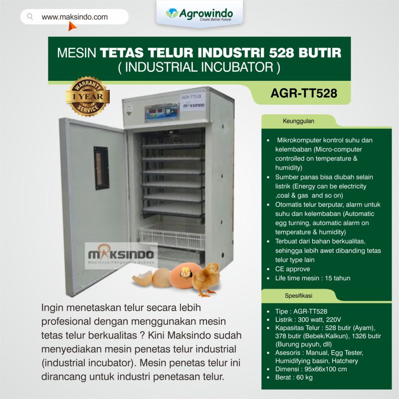 Ingin menetaskan telur secara lebih profesional dengan menggunakan mesin tetas telur berkualitas ? Kini Maksindo sudah menyediakan mesin penetas telur industrial (industrial incubator). Mesin penetas telur ini dirancang untuk industri penetasan telur.