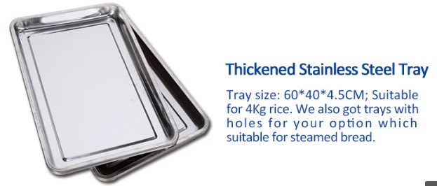 Setiap pembelian mesin ini akan mendapatkan nampan tanpa lubang. Tersedia nampan berlubang (perforated) dengan harga terpisah