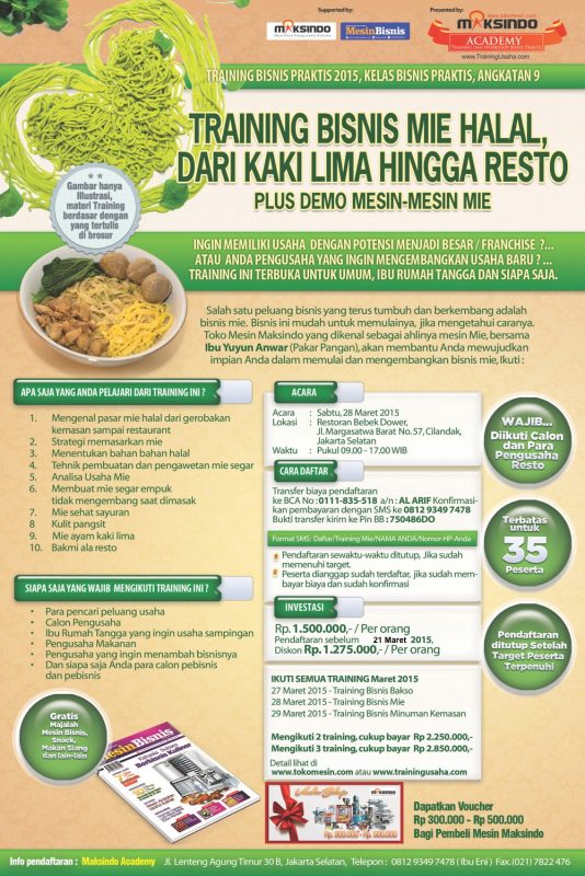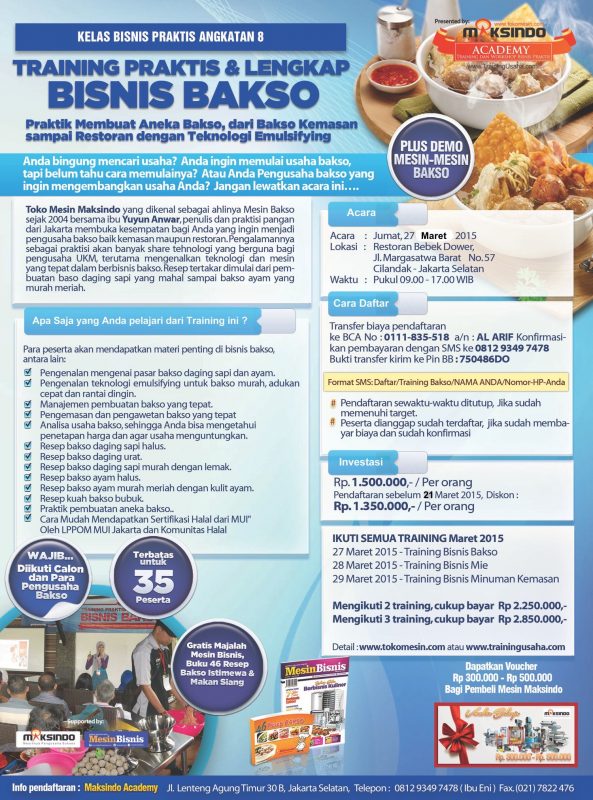 Ikuti training bisnis kuliner (bakso, mie dan aneka minuman kemasan) di Maksindo Academy pada tanggal 27, 28 dan 29 Maret 2015.