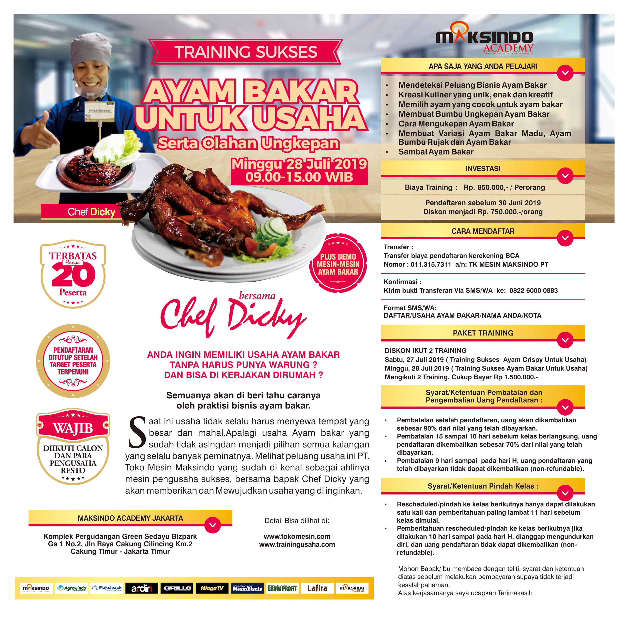 Semuanya akan di beri tahu caranya oleh praktisi bisnis ayam bakar. Saat ini usaha tidak selalu harus menyewa tempat yang besar dan mahal. Apalagi usaha Ayam bakar yang sudah tidak asingdan menjadi pilihan semua kalangan yang selalu banyak peminatnya. Melihat peluang usaha ini PT. Toko Mesin Maksindo yang sudah di kenal sebagai ahlinya mesin pengusaha sukses, bersama bapak Chef Dicky yang akan memberikan dan Mewujudkan usaha yang di inginkan.
